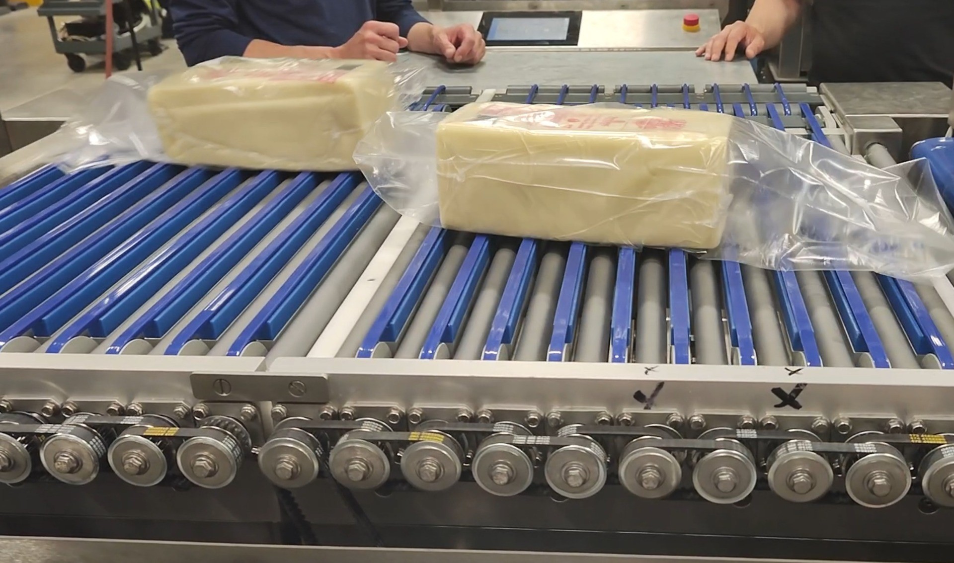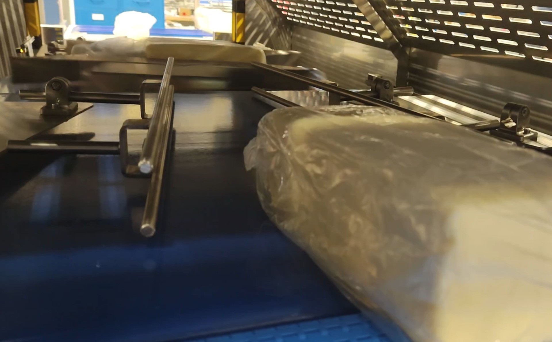 Die Zuführanlage für eine Vakuumverpackungsmaschine übernimmt die bereits in Beutel abgepackten Lebensmittel, wenn nötig können die Produkte um 180° gewendet werden und positioniert die Produkte am Winkelförderer für nachfolgende Prozesse. Abhängig von der Produktlänge werden entweder zwei oder nur ein Produkt Ein- oder Auslaufseitig positioniert.